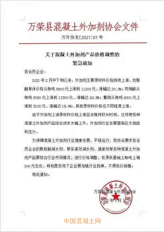 在此倡議:外加劑企業(yè)及時(shí)關(guān)注原料市場(chǎng)動(dòng)態(tài),積極組織貨源,力保產(chǎn)品供應(yīng);下游混凝土企業(yè)和工程建設(shè)單位理解原料價(jià)格變動(dòng)給外加劑企業(yè)帶來(lái)的成本增加,及時(shí)調(diào)整外加劑采購(gòu)價(jià)格。讓我們攜手共渡難關(guān)!